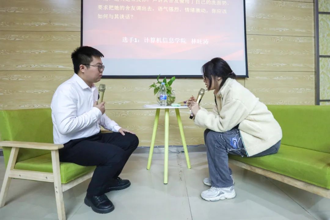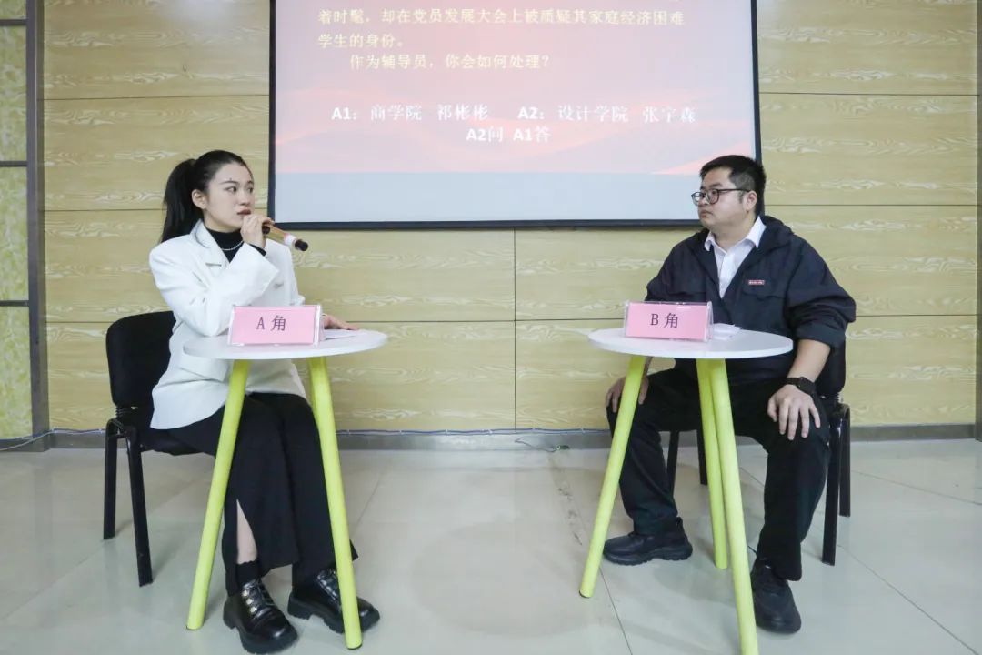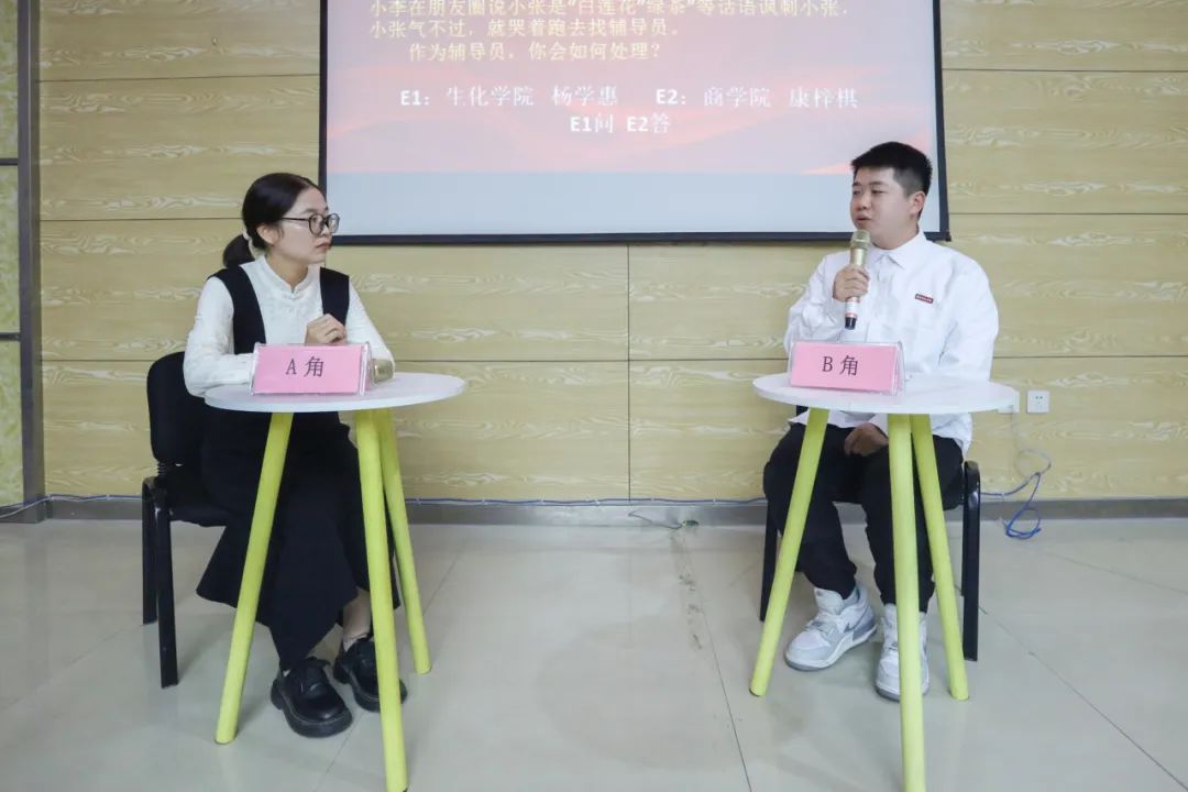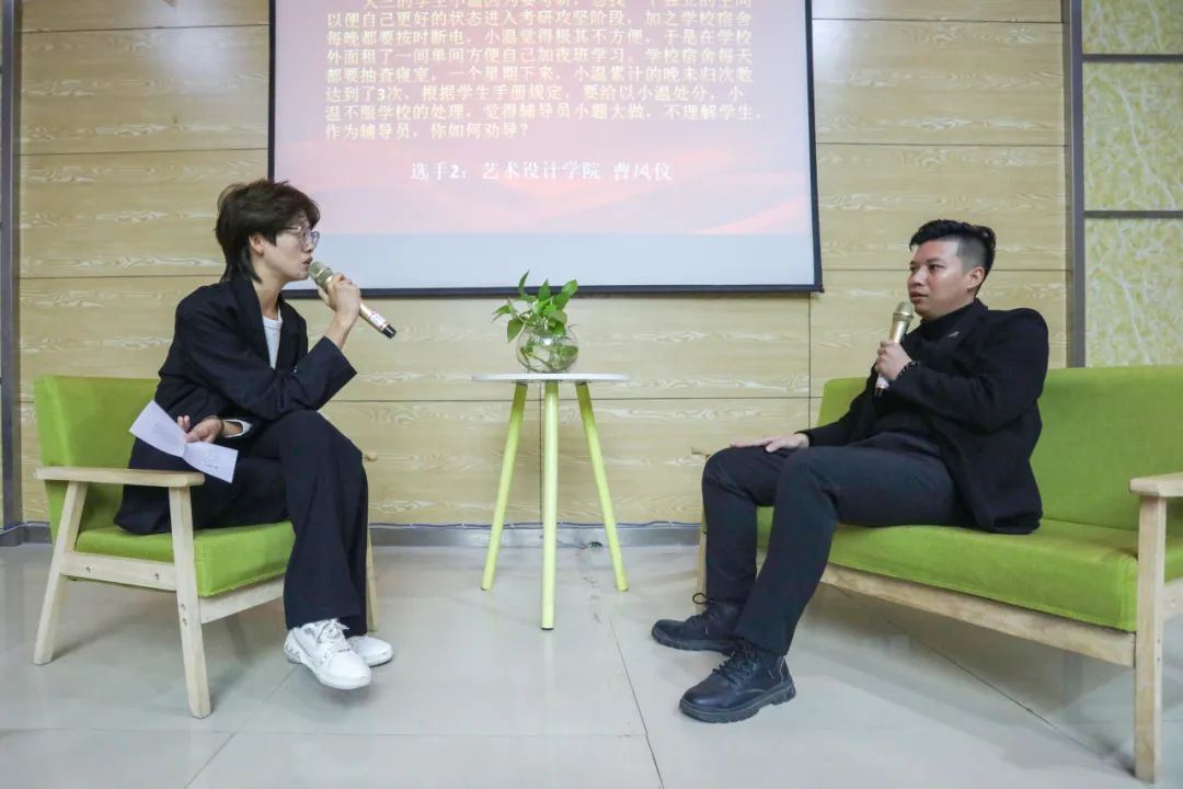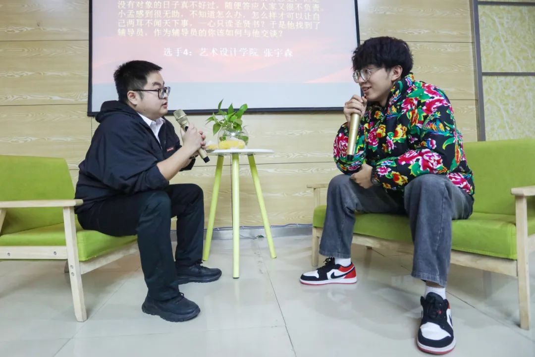 在“谈心谈话”环节,参赛辅导员围绕学生考研升学、就业择业、人际关系、情感问题、校规校纪、职业生涯规划等学生工作典型问题,与助演学生展开深入细致的谈心谈话和循循善诱的教育引导,展现了辅导员良好的专业素养和育人温度。
