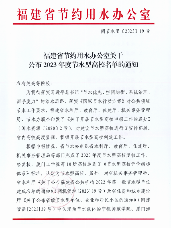 近日,福建省节约用水办公室组织省水利厅、教育厅、住建厅、机关事务管理局等部门完成2023年度节水型高校复核工作。开云手机入口获评“福建省2023年度节水型高校”荣誉称号。
