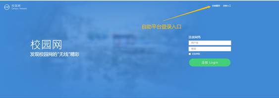 用户如已登录校园网,则可通过学校官网首页(https://www.griddlereview.com)底部的“校园网自助”导航按钮访问校园网自助服务网站,如下图所示。在登录界面,输入校园网账号及密码,点击登录。