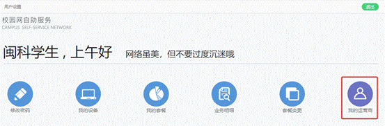 (3)自助服务页面,点击“套餐变更”,弹出页面显示默认套餐为校园网,点击“变更当前套餐”,勾选刚绑定的运营商名称,依次点击“下一步”“确定”