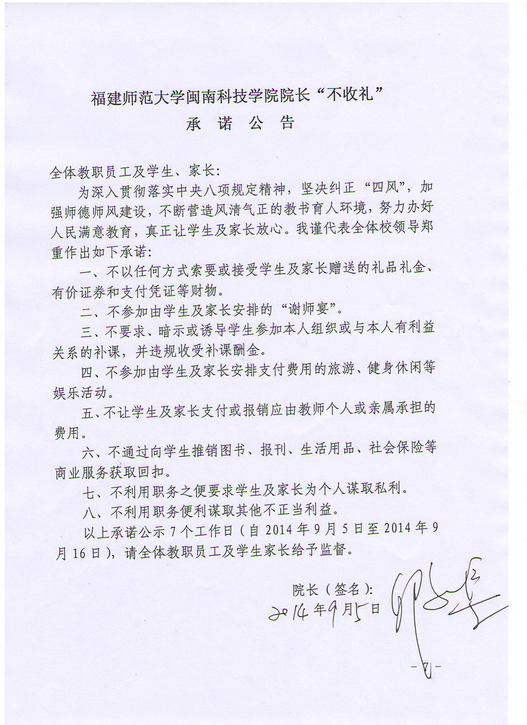 福建师范大学开云手机入口院长“不收礼”承诺公告